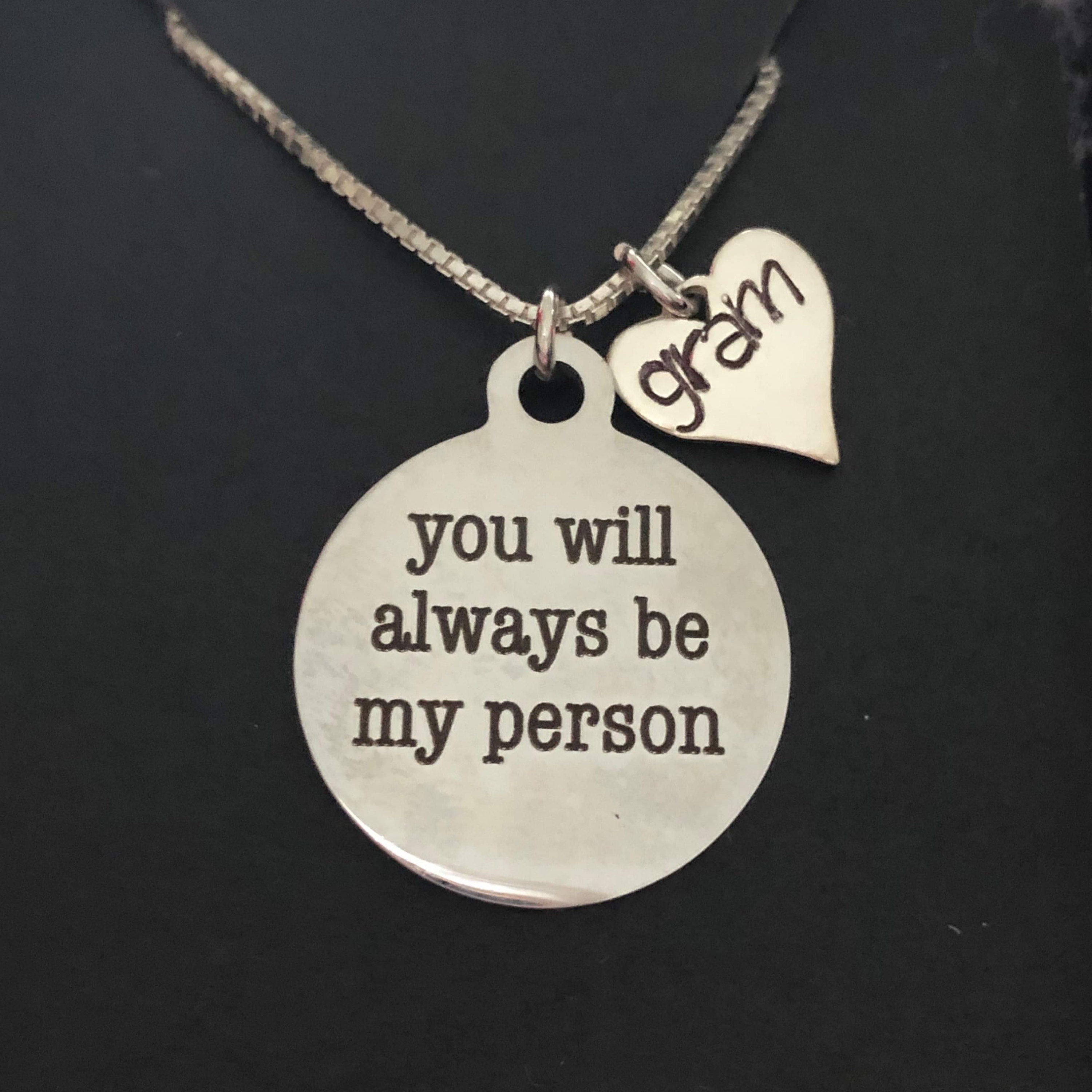 This necklace is a 3/4 inch stainless steel round that is laser engraved with the words “You Will Always Be My Person”. It is on a sterling silver box chain. You can choose an 18” or 20” chain. I have other lengths by request.